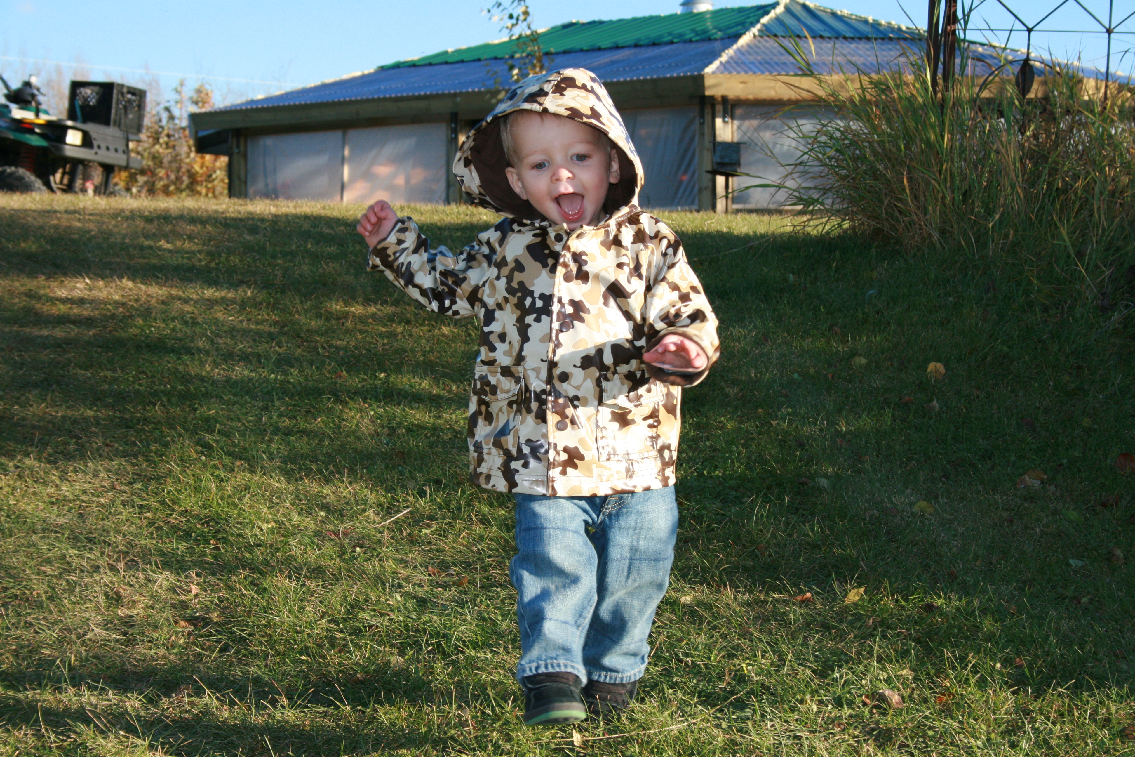 He is now 2 years old. Yes it has been two years! Active and talking (incessantly)! The picture is of him running down a hill in October.